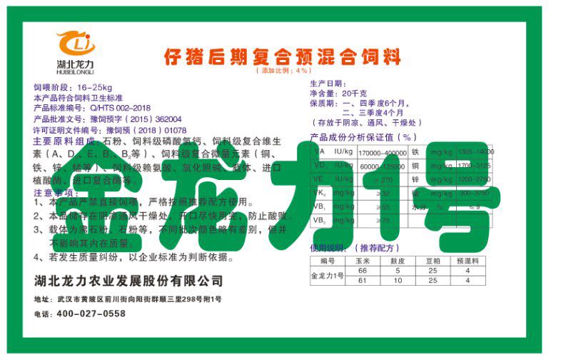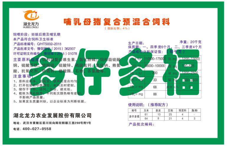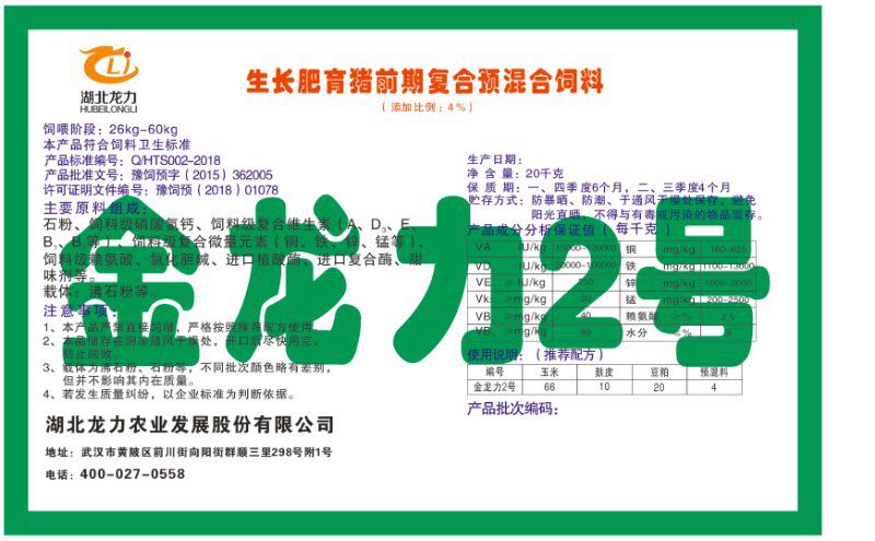 湖北龍力農(nóng)業(yè)發(fā)展股份有限公司坐落于武漢市黃陂區(qū)前川街向陽街群順三里298號附1號。公司成立于2014年6月,公司自成立以來把“創(chuàng)全球最大養(yǎng)豬綜合服務”為企業(yè)愿景。致力于打造教保料品牌”作為公司發(fā)展的明確目標。公司一直致力于豬營養(yǎng)的研究和開發(fā),積極與國內(nèi)外高校和科研機構(gòu)合作,推廣養(yǎng)豬技術、動物營養(yǎng)新概念,向世界農(nóng)牧企業(yè)學習與合作。公司采用國內(nèi)先進的生產(chǎn)工藝,選擇高精度電子配料秤,高均勻度、無殘留混合機等先進設備....